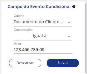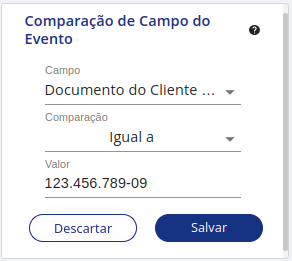 | Configuração da caixa "Comparação de Campo do Evento" em que o documento do cliente está sendo analisado para verificar se é igual a "123.456.789-09". | Este é um exemplo da estrutura que deve ser implementada para utilização da caixinha de Comparação de Campo do Evento. |