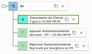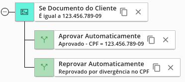 | Configuração da caixa "Campo do Evento Condicional" em que o documento do cliente está sendo analisado para verificar se é igual a "123.456.789-09". | Aqui está um exemplo da estrutura analisada na árvore de regras, em que está sendo avaliado se o CPF do cliente é igual a "123.456.789-09". Se o CPF for igual ao dígito mencionado, o cliente será aprovado, caso contrário será reprovado. |
