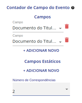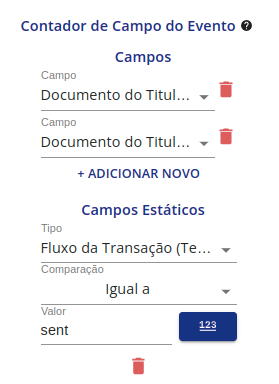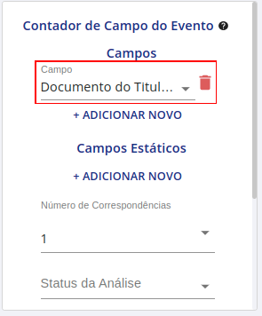 O primeiro campo disponível para edição ao iniciar a configuração do componente de "Contador de Campo do Evento" é justamente chamado "Campo", em que é possível selecionar uma variável da payload e definir esta variável como um dos critérios a ser analisado. No exemplo ao lado é selecionada a variável "Documento do Titular da Conta de Origem". Deste modo, toda transação que passar pelo motor de regras será analisada e a caixinha contará quantas vezes o titular daquela dada conta origem da transacção em questão transacionou. Caso seja necessário incluir mais uma variável como critério, é necessário clicar no botão "Adicionar Novo". |