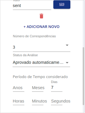 Indo para baixo dentro da configuração do componente é possível escolher quantos campos deverão dar match para que ocorra a contagem. No exemplo ao lado ficou definido como "3", ou seja, todos os 3 critérios criados deverão coincidir para que haja a adição na contagem. Além disso foi definido que somente as transações Aprovadas automaticamente deverão ser contadas e o período levado em conta deverá ser de 7 dias. |