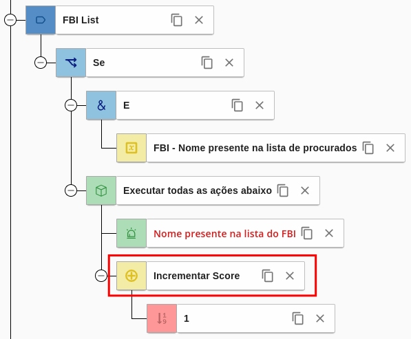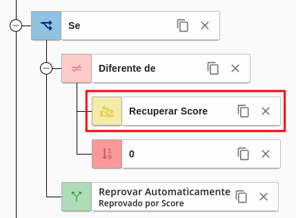 Ambos componentes são utilizados com o intuito de atribuir uma pontuação em diferentes critérios de saída, valendo-se deste número na tomada de alguma ação ou decisão. O "Incrementar Score" é responsável por guardar os valores conforme o fluxo exigir, se determinada validação não acionar esse componente, o valor não será acumulado. No momento em que for desejado, você poderá resgatar este número com o "Resgatar Score" para continuar a execução da regra com base nele. Estes recursos são muito utilizados quando queremos passar por toda a regra sem tomar nenhuma decisão que interrompa as outras etapas e, somente ao final, tomar as decisões com base na pontuação obtida. O valor atribuído varia com base no que é relevante para a sua operação.